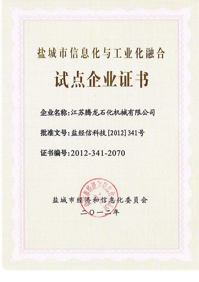 盐城市信息化与工业化融合试点企业证书